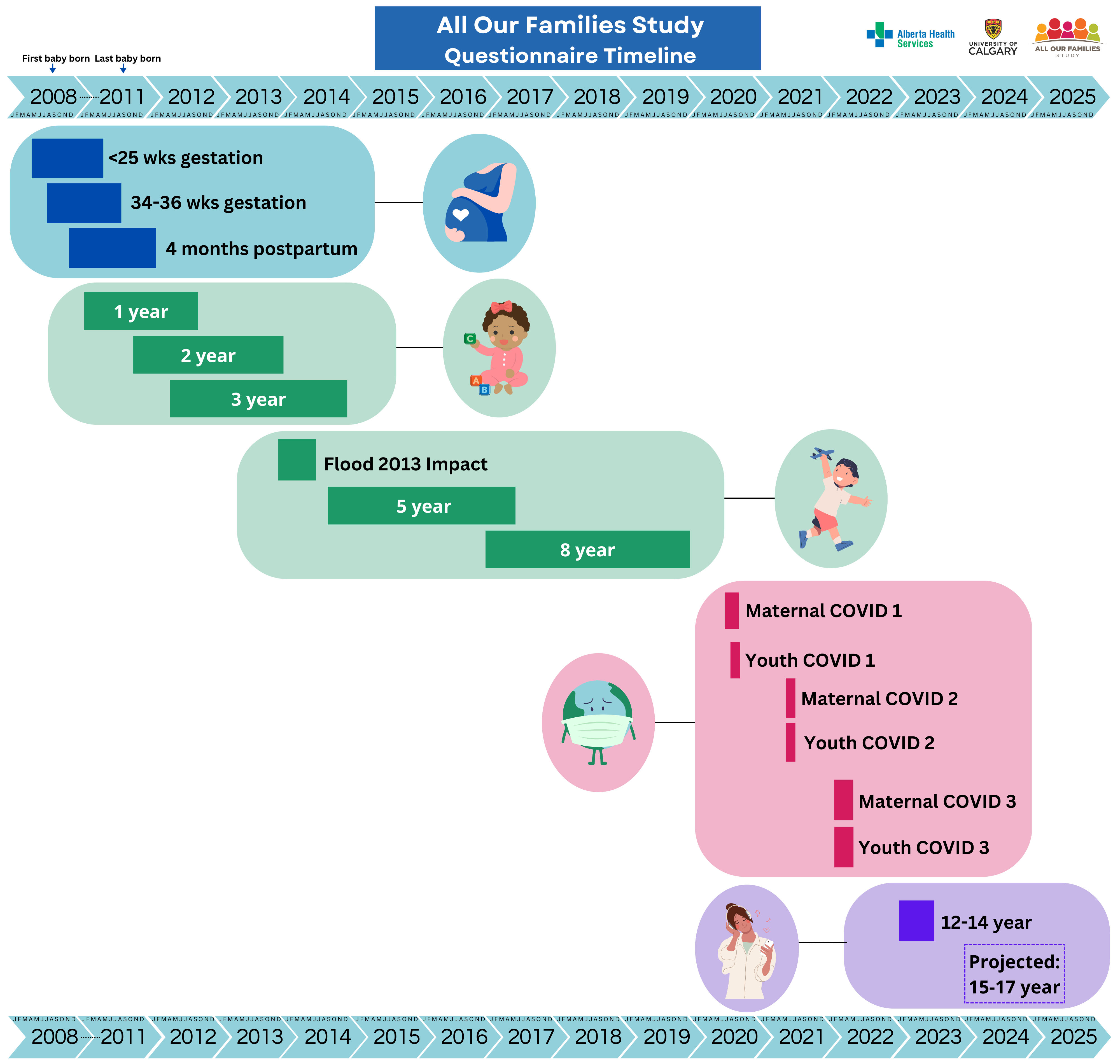 Participating families have completed routine questionnaires at time points relevant for understanding child development and family well being, and they also participate in important topical questionnaires when major events happen such as the H1N1 outbreak (2009), the Calgary Flood (2013), and the COVID-19 Pandemic (2020-2023). Some of our research has involved in-person assessments of children, where families have contributed further by coming to our research centre to meet with researchers and engage in developmental assessments.