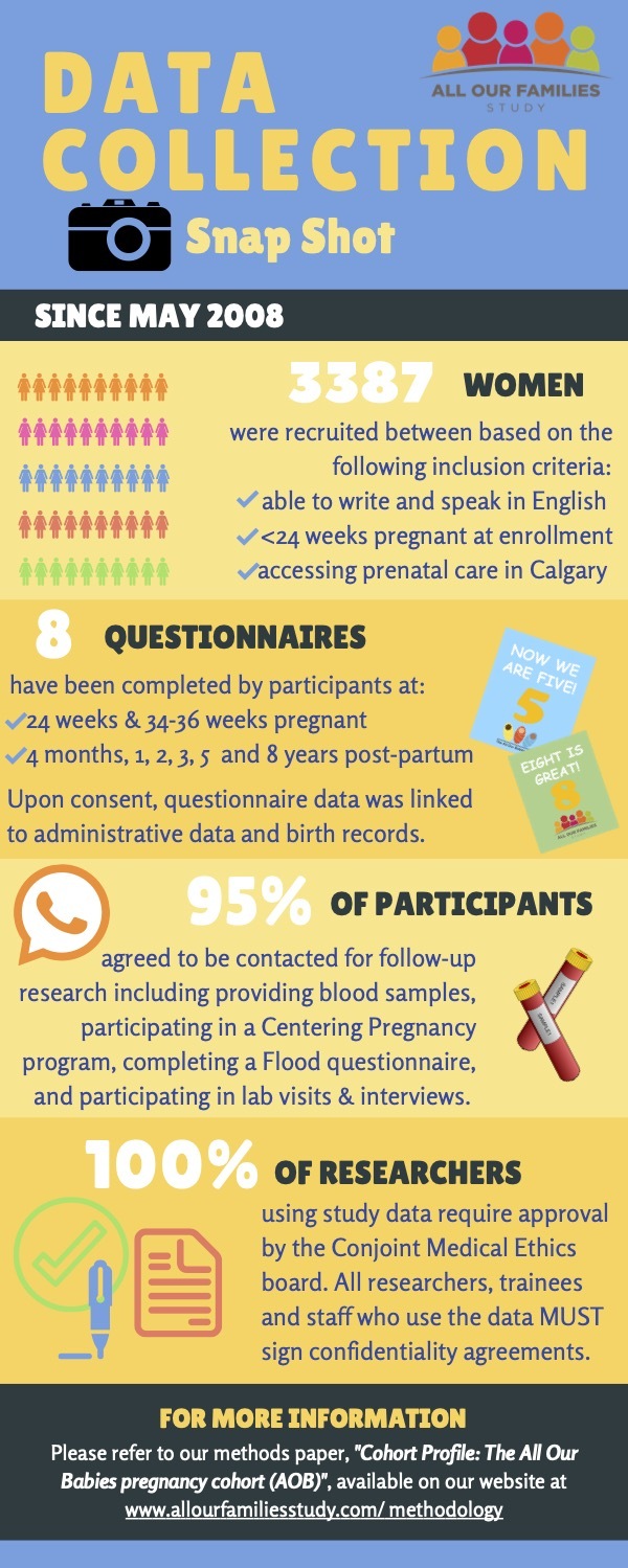 All Our Babies (AOB) is a community-based, longitudinal pregnancy cohort developed to investigate the relationships between the prenatal and early life periods and outcomes for infants, children and mothers. The design of AOB follows a life course perspective, whereby the influence of early events on long-term health and development of both mothers and children are investigated through examining factors across life stages.
